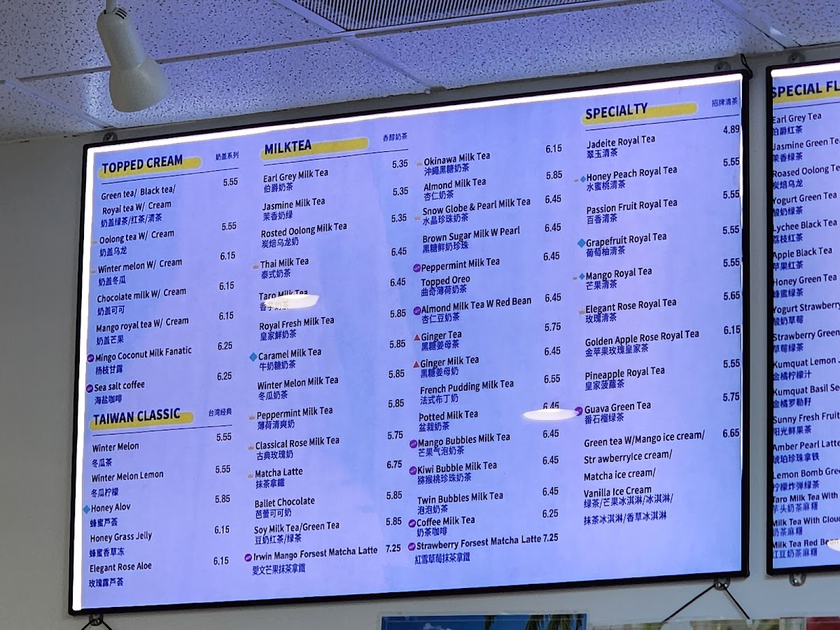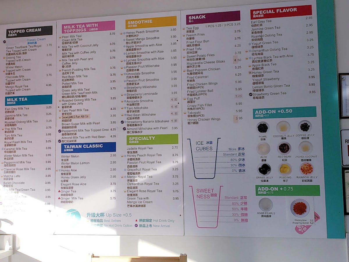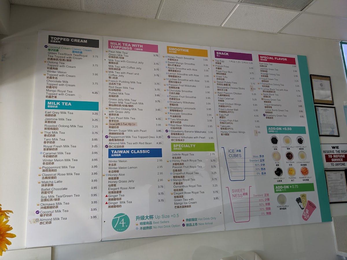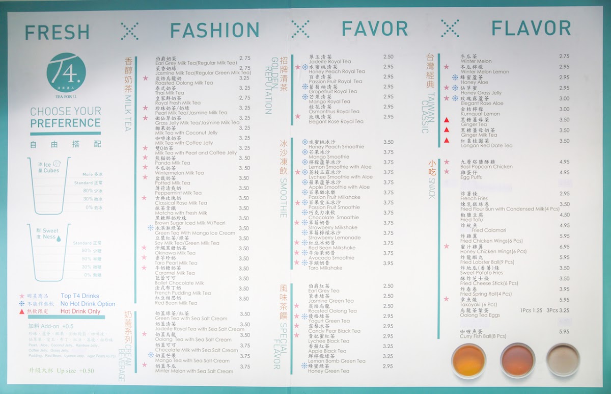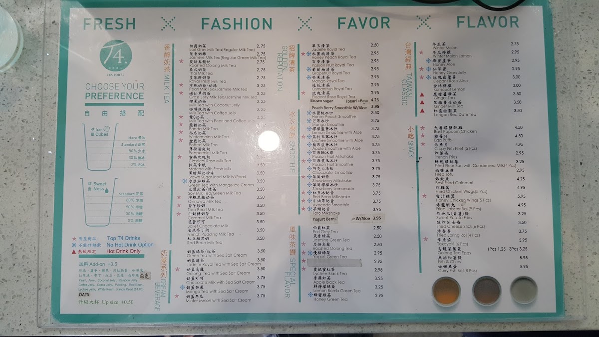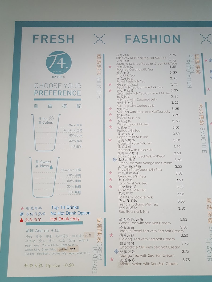 From a reviewer’s perspective, the menu at T4. Tea For U offers a satisfying mix of classic Taiwanese drinks and hearty bites, making it easy to find something for every craving. Their milk tea selection stands out with staples like Royal Fresh Milk Tea, Jasmine Milk Tea, and Roasted Oolong Milk Tea, alongside more unique options such as Okinawa Milk Tea and Classical Rose Milk Tea. The “Taiwan Classic” section adds comforting flavors with items like Ginger Milk Tea (HOT) and Honey Grass Jelly, while fruit-forward choices like Winter Melon Lemon keep things refreshing. Smoothie lovers can enjoy indulgent blends like Strawberry Banana Milkshake and Avocado Smoothie, and the “Special Flavor” lineup-featuring Kumquat Lemon and Green Tea Mango Ice Cream-adds a creative twist. On the food side, the addition of dim sum such as Siu Mai (Pork Dumplings) and Soup Dumplings (Xiao Long Bao) enhances the menu’s appeal, complemented by filling options like Taiwanese Braised Beef Rice and Chicken Katsu with Rice/Fries. Snack items like Mozzarella Cheese Sticks and wings in flavors like Mango Flavor (6pcs) round out the experience. Overall, the menu feels diverse and well-balanced, blending traditional Taiwanese favorites with modern, playful variations.